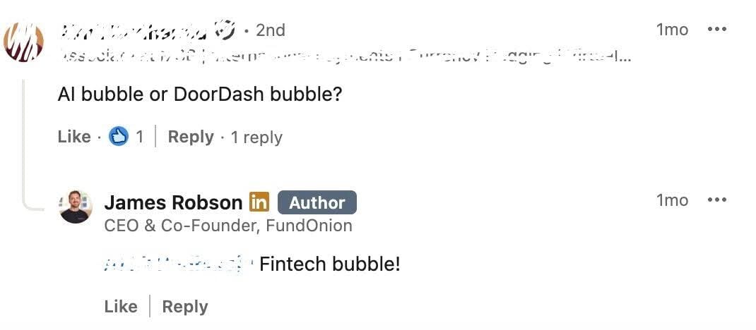 The LinkedIn comment on this post compared Klarna to the AI bubble or the DoorDash bubble.