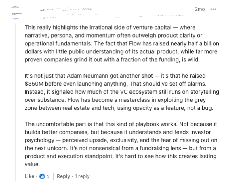 “This really highlights the irrational side of venture capital - where narrative, persona and momentum often outweigh product clarity or operational fundamentals. The fact that Flow has raised nearly half a billion dollars with little public understanding of its actual product, while far more proven companies grind it out with a fraction of the funding, is wild”.