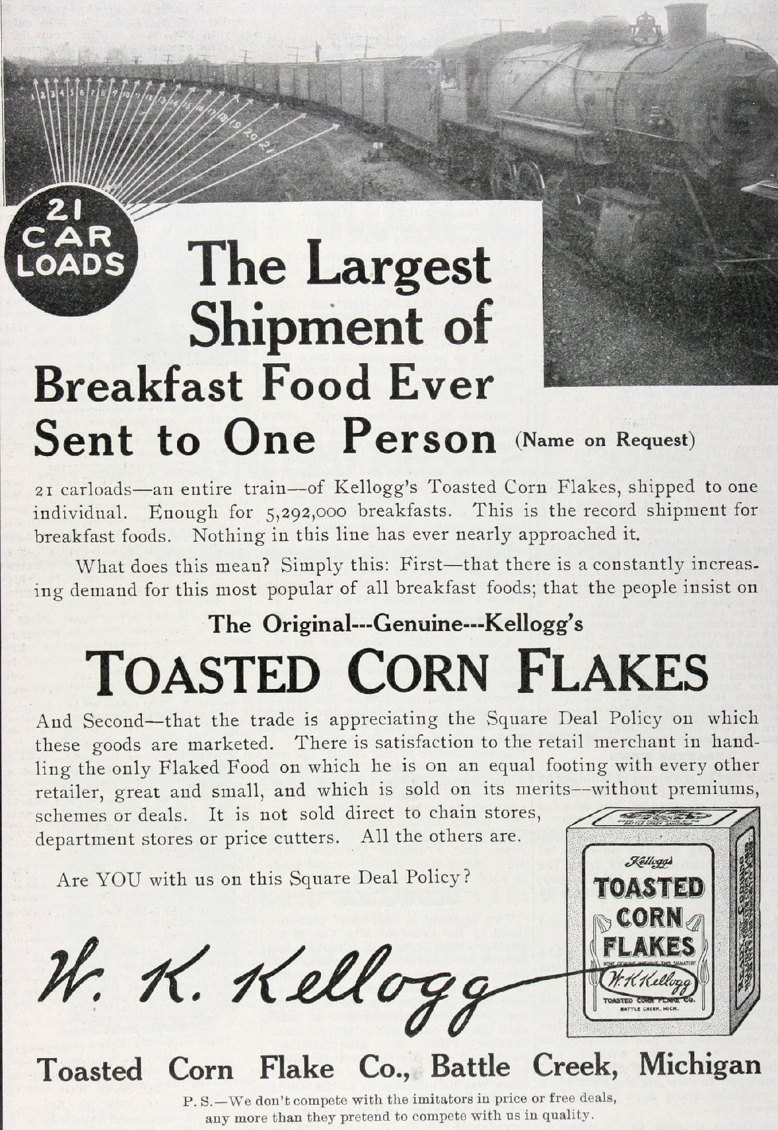 Guests took boxes home. Demand grew naturally. But J.H. point-blank refused the idea of taking his cereal to the market.